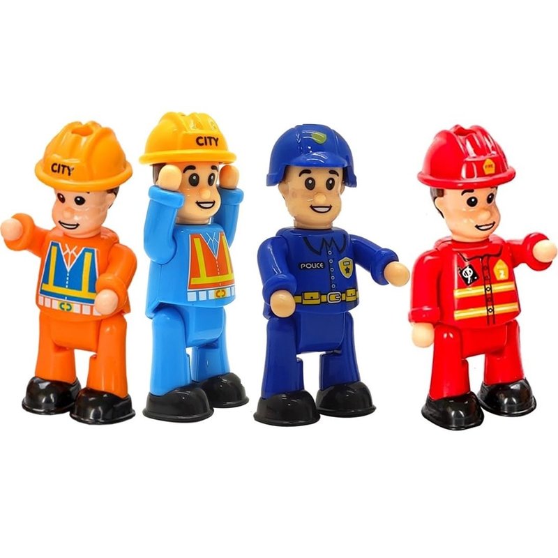 • Educational Action Figures: This mixed 4-pcs set of community helper figurines for kids includes a firefighter, construction worker, police officer, sanitation worker /city community helper.