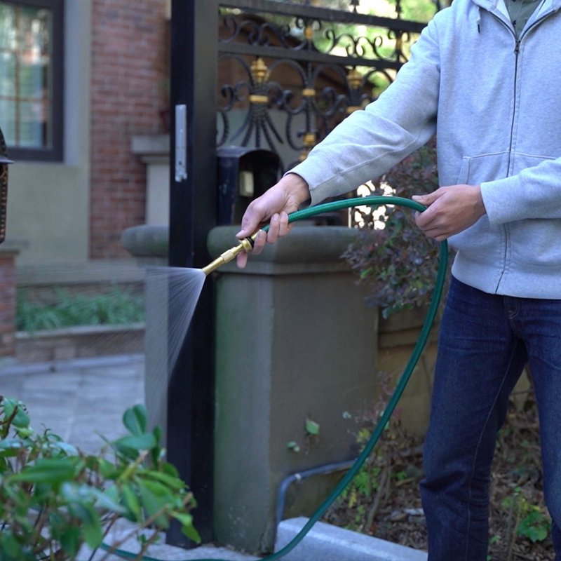 To use this hose, all we needed to do was remove the cardboard label and the outer packing. Then, we simply attached the fitting to our spigot and turned on the water. We found that the hose fits easily onto our outdoor faucet and accessories, such as spray nozzles and sprinklers (the package didn’t include any attachments). There was no leaking and no muscle needed to connect or disconnect.