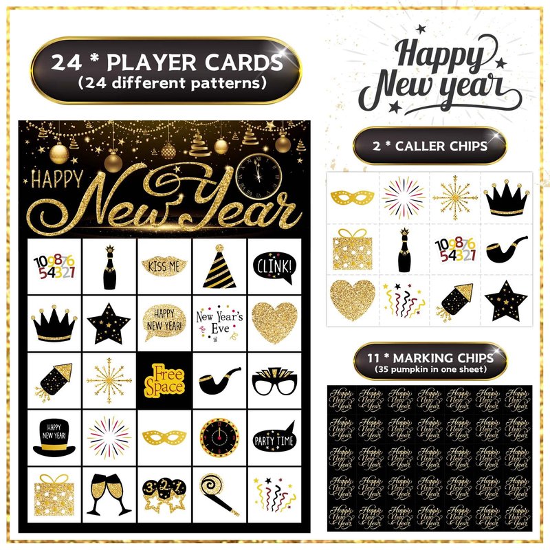 - 【LARGER NEW YEAR GAMES FOR PARTY PACKAGE】Happy new year game bingo includes 24 unique kids bingo player cards, 385 marking chips, and 2 caller chips.Support numbers to playing ,great family and even mommy time game with your kiddo.