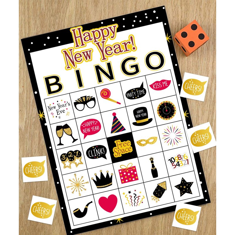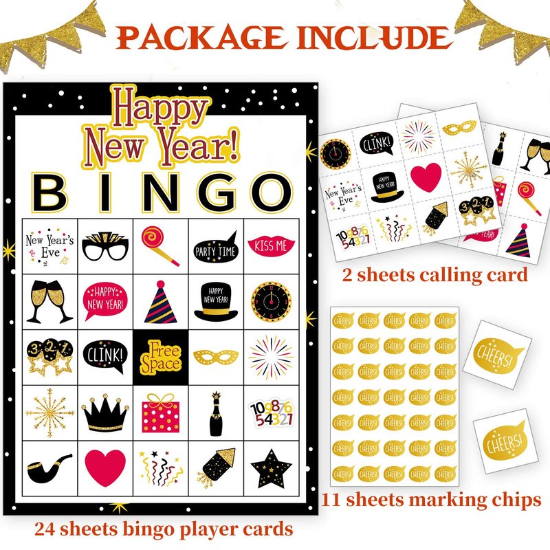 - LARGER NEW YEAR GAMES FOR PARTY PACKAGE: Happy new year game bingo includes 24 unique kids bingo player cards, 385 marking chips, and 2 caller chips.Support numbers to playing ,great family and even mommy time game with your kiddo.