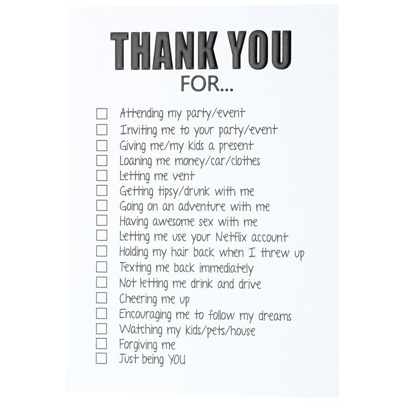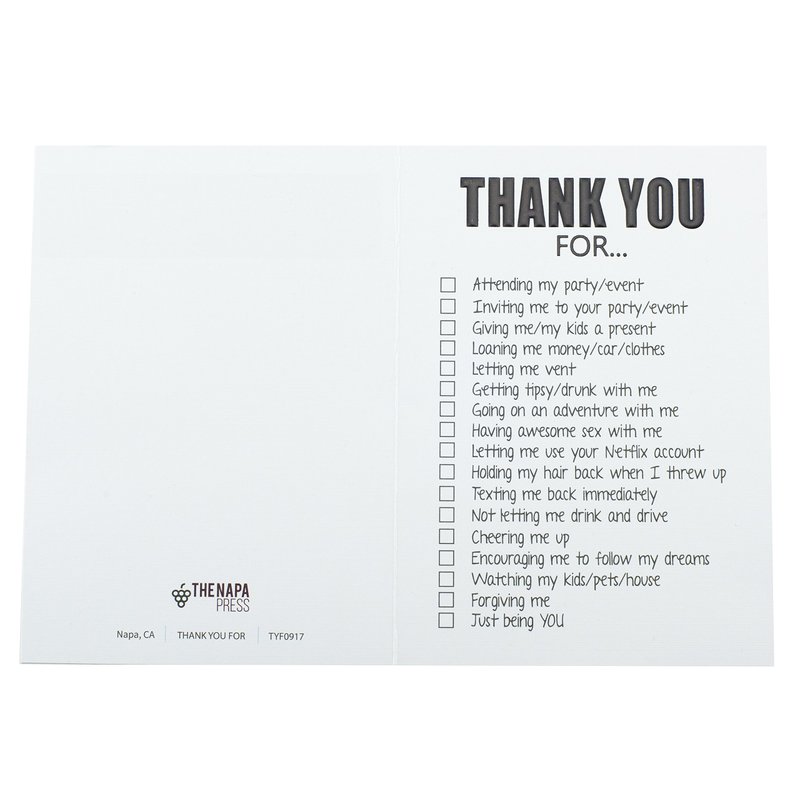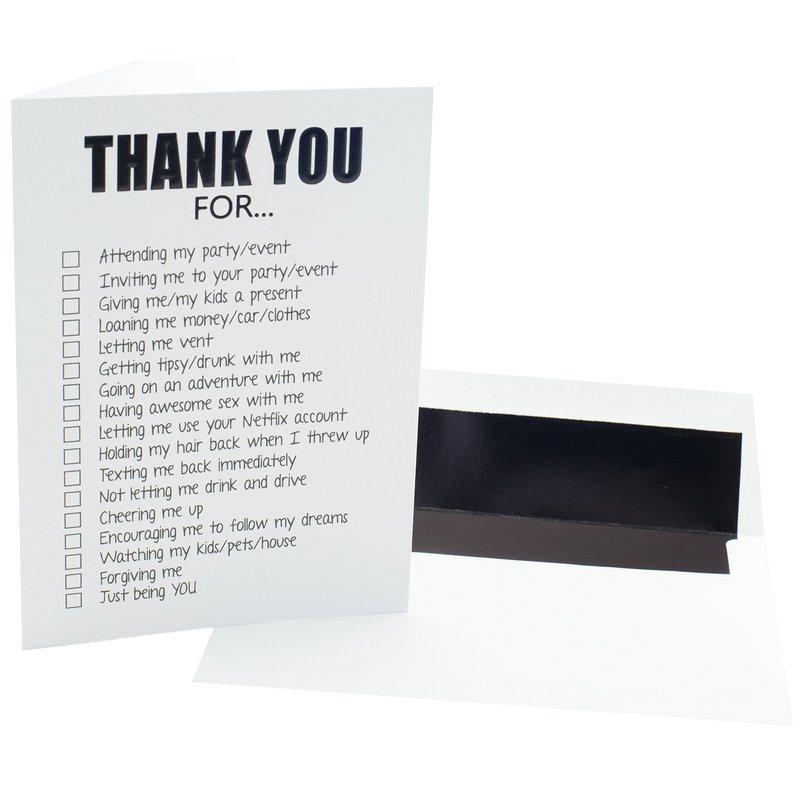 Pack of 20 Funny Thank You Cards with Black Foil Lined Envelopes. Printed on Heavyweight 300 GSM Linen Textured Cardstock. The Black Foil Embossing Makes for a Simple Black and White Design. Card Cover Reads "Thank You For... Attending my party/event Inviting me to your party/event Giving me/My Kids a present Loaning me money/car/clothes Letting me vent Getting tipsy/Drunk with me Going on an adventure with me Having awesome sex with me Letting me use your Netflix account Holding my hair back when I threw up Texting me back immediately Not letting me drink and drive drive Cheering me up Encouraging me to follow my dreams Watching my kids / pets / house Forgiving me Just being YOU" with Multiple Check Box Options to Choose From. Card Inside is Left Blank for Your Own Personalization. Perfect for All Occasions. Funny Greeting Cards for Personal or Business Use. Can be Mailed in the Included Black Foil Lined White Envelopes. A7 Cards Measure Approximately 5" x 7" and Envelopes 5.125" x 7.25"
