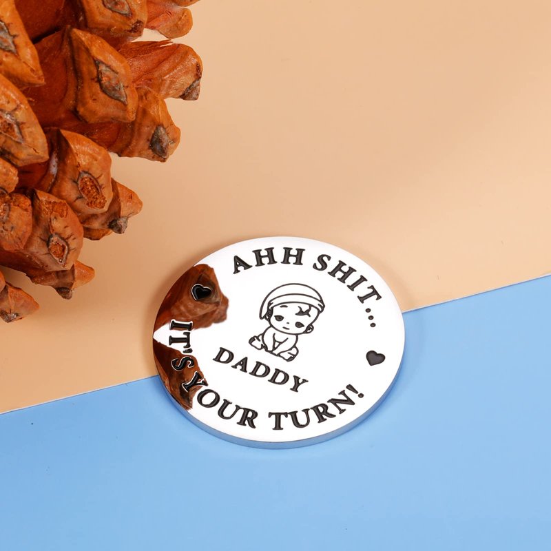 Funny double-sided decision coin engraved with” oh sht daddy it’s your turn, oh mummy it’s your turn!”