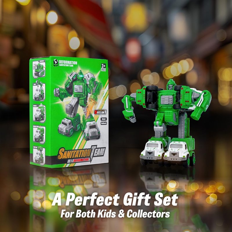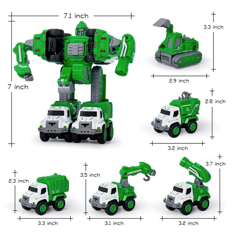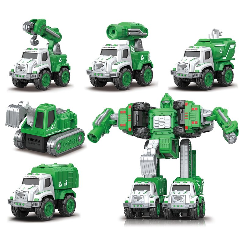 • Sanitaion Team Deformation Toys - 1*excavator, 1*crane, 1*sprinkler, 1*garbage truck, 1*spray car, 5-in-1 deformation set, improve children's hands-on ability, exercise thinking creativity.