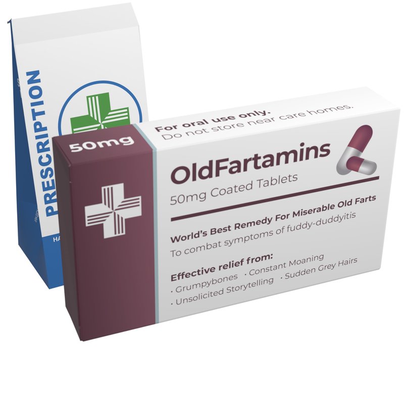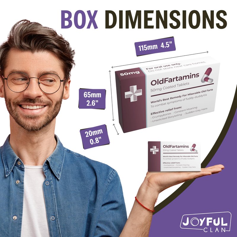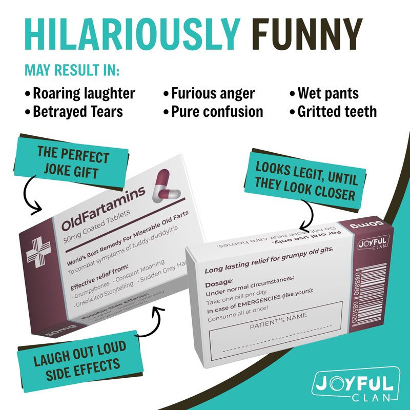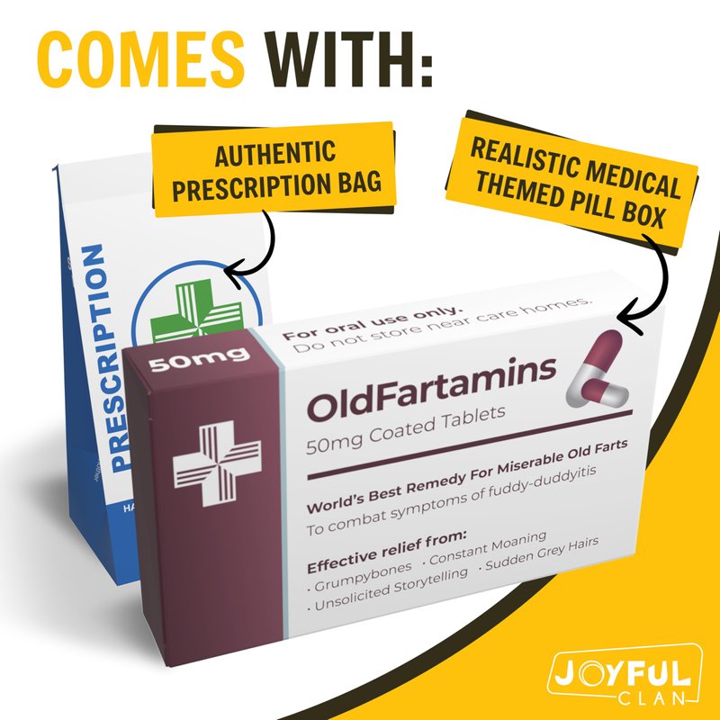 Old Fartamins Age gracefully? Nah, why not age disgracefully with OldFartamins - the hilarious gag gift that proves you're only as old as your sense of humour! Crafted with care and a generous dash of irreverence, this pretend prescription pill box is more than just a gift - it's a reminder that getting older doesn't have to mean getting boring. Birthday gag gift Picture the look on your friend's face when they unwrap a box of OldFartamins on their 40th birthday - a mix of shock, amusement, and maybe a touch of existential dread. Packed with jelly beans in a pretend prescription pill box, this humorous gift is guaranteed to elicit laughs and maybe even a few groans. After all, what better way to celebrate another year than with a hearty dose of laughter? Realistic pill box filled with jelly beans But it's not just about the laughs - it's about the message behind the madness. With OldFartamins, there are no actual pills, just jelly beans but be prepared, they might just leave a sour taste in a grumpy old persons mouth. And thanks to the realistic packaging, complete with a very realistic prescription paper bag, you can rest assured that your gift will look as authentic as it is amusing. Laughs all round Of course, the real magic of OldFartamins lies in its ability to turn even the most mundane moments into opportunities for laughter. Whether it's combatting grumpybones or warding off sudden grey hairs, this humorous gift is guaranteed to bring a smile to even the most mature of faces. So why settle for boring gifts when you can give the gift of laughter with OldFartamins? BUY NOW and enjoy the fact that age may be just a number, but laughter is timeless - so why not embrace the absurdity and share a laugh with those who matter most?