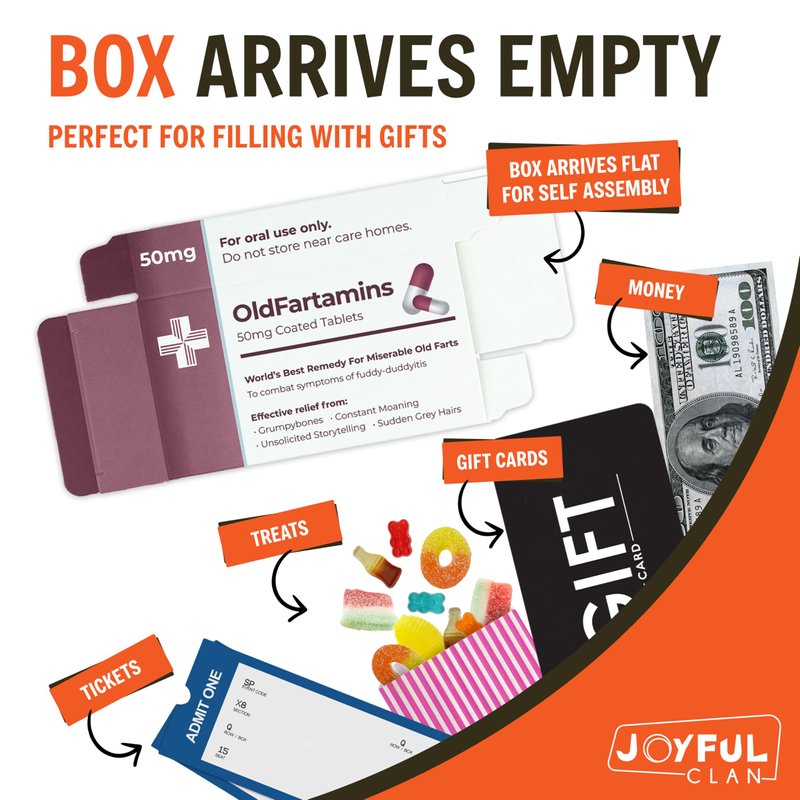 - EMPTY BOX FOR YOU TO FILL - fill this funny gift box with whatever you fancy - whether it's cash, vouchers, candy, or even a handwritten note, OldFartamins lets you tailor your birthday wishes to suit your friend or family members taste.