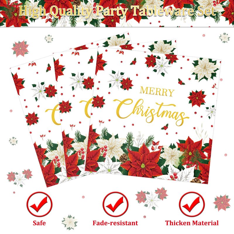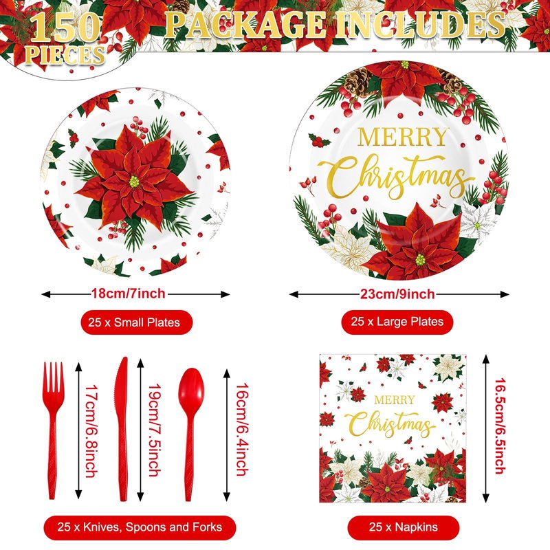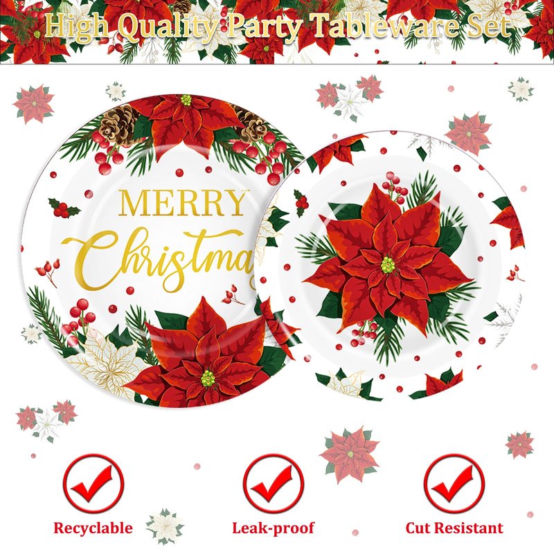 - Christmas Theme Design: these Christmas tableware set are designed with poinsettia flower patterns; The poinsettia paper plates and napkins further emphasize the holiday ambiance, making your Christmas day more memorable
