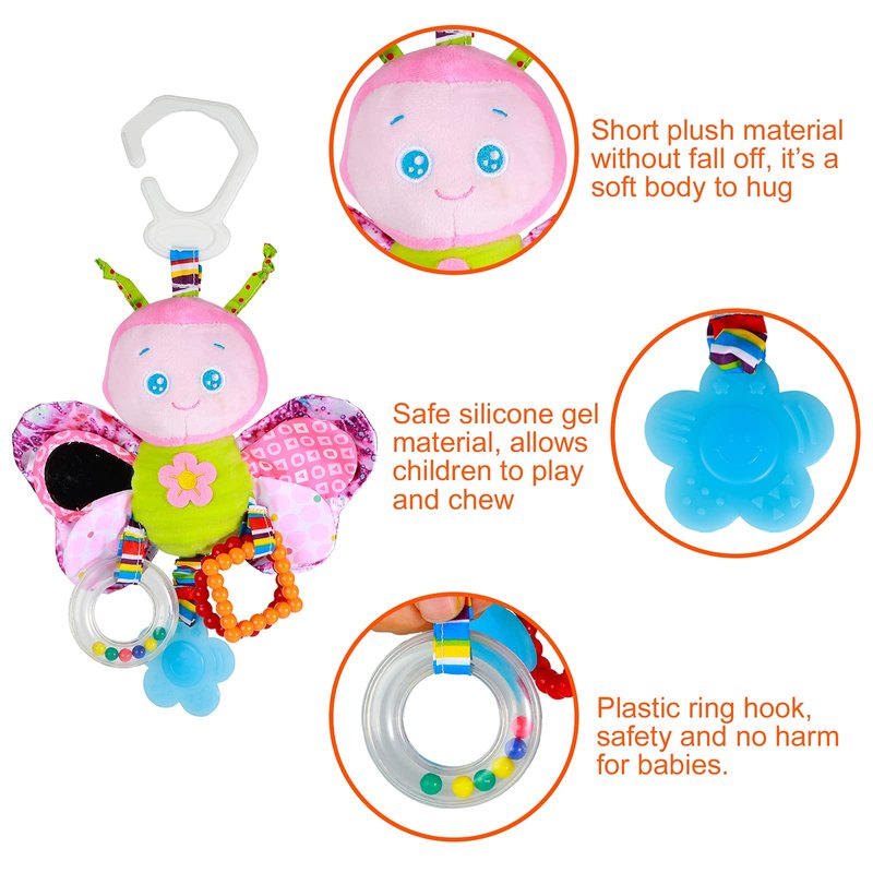 - 【Carseat Toys for Infants】This car seat toy features a discovery mirror, crinkle wings... and it will make a lovely sound when you shake it, keeping your baby happy while stimulating their senses. (NOTE: Without playing music function!)