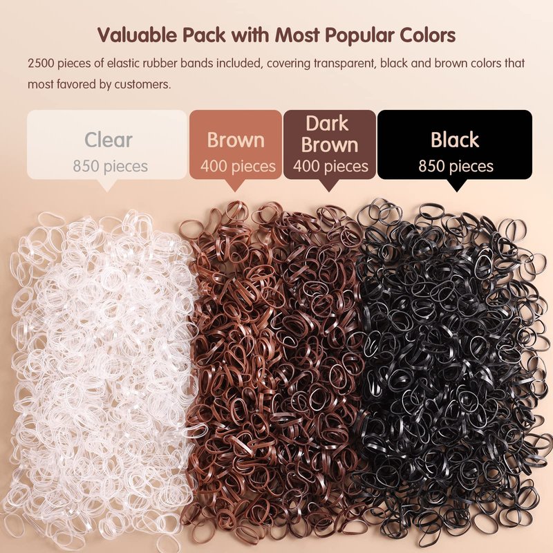 - 2500 Pieces in 4 Classic Colors: This package come with 1) 2500 strips of mini elastic hair bands and 2 pcs of hair tools, 2) a functional reusable organized box, with detachable grids. Each color is packaged separately in one grid, clean and tidy. These soft hair elastics ties are made of rubber material, with good elastic not easy to break, comfortable to wear.
