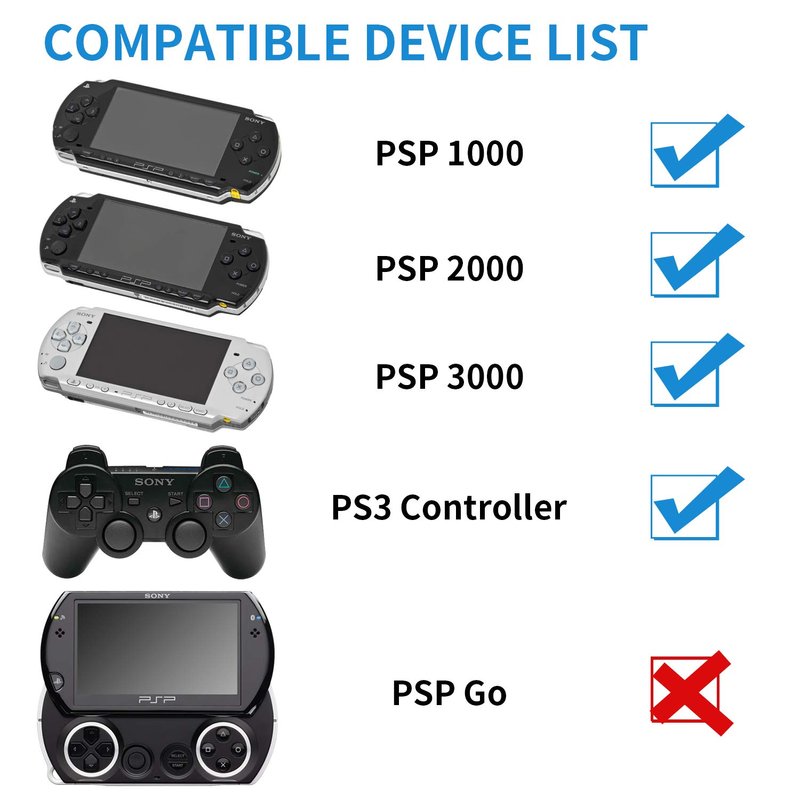 - Cable Length: 3.9 ft. 2 Cables Pack. Compatible with Sony PSP 1000 2000 3000 Series (PSP-1001, 2001, 3001) and the latest E-1000 model. Also supports PS3 DualShock 3 Controller if you still have one. Not compatible with PSP Go version.