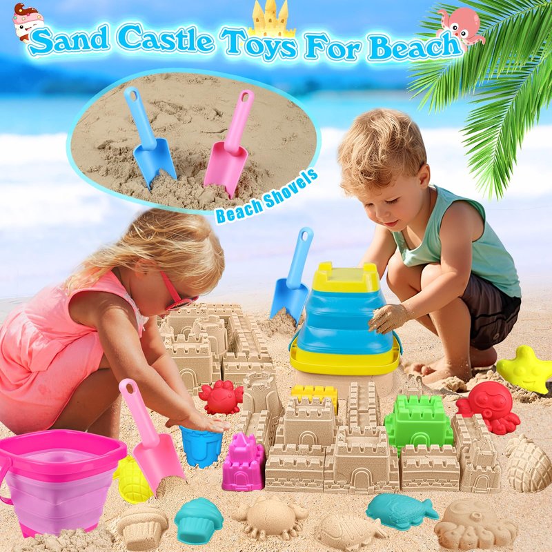 - Multi-functional Collapsible Beach Bucket: Beach toys for toddlers are equipped with 2 collapsible silicone beach buckets, the beach bucket is also a large castle beach mold. Also perfect for a drink cooler, cleaning, washing, etc. A collapsible bucket is durable and easy to store, saving space. Made with durable premium silicone material, the quality is better than other plastic beach pails