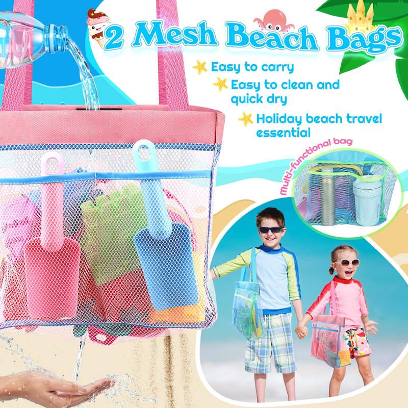 - Easy Carry & Storage Mesh Beach Bag: All travel beach toys are packed in 2 high-quality beach bags, the mesh beach bag is perfect for going to the beach, on vacation, etc. The breathable mesh design will make it dry quickly and can help drain out sand and water. The mesh bag for sand toys is very convenient for carrying and storing beach sand toys for outdoor activity and beach travel. The mesh bag has two outside pockets to store supplies other than beach toys