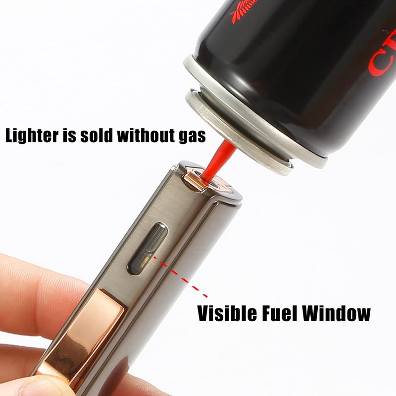 - โถใVISIBLE GAS WINDOW & PROTECTIVE COVERใ- Donโt worry about when to refuel gas to the lighter, tilt the lighter back and forth to see the remaining butane, The protective cover effectively protects the burner from being blocked and prevents accidental ignition of the lighter.