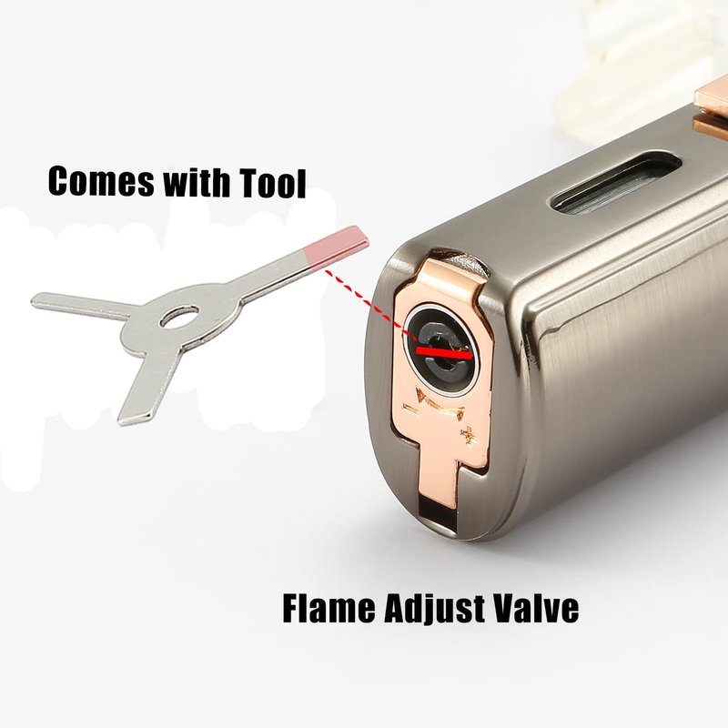 - โถใREFILLABLE & ADJUSTABLEใ- Unlike disposable lighters, This triple jet flame butane lighter is refillable, Longer life and more environmentally friendly. Flame adjustment valve is located at the bottom of the lighter, we provide a adjustment plate tool so you can always get the flame size you want.