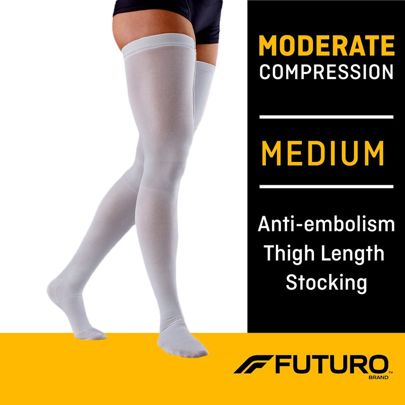 - Futuro Anti-Embolism Thigh Highs, Unisex, Moderate Compression, 15-20 mm/Hg, Medium, White, Helps Reduce Formation of Blood Clots