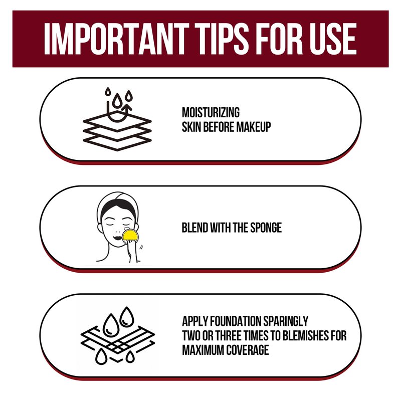 HOW TO APPLY: Use a moisturizer/primer first to hydrate your skin; apply foundation to your skin by blending out gently with your finger or sponge; apply to skin imperfections multiple times to get a better concealing effect; Use a setting powder for longer-wear makeup.