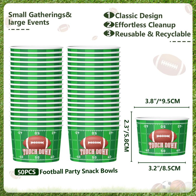 - Package Includes: You will receive 50 football touch down theme paper bowls in green, each measuring 3.8 x 3.2 x 2.3in/9.5 x 8 x 5.8cm, with a capacity of 9oz, designing with football element, providing you with enough quantity to meet the needs of your football themed or other themed parties.