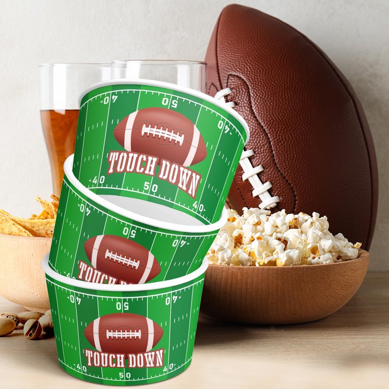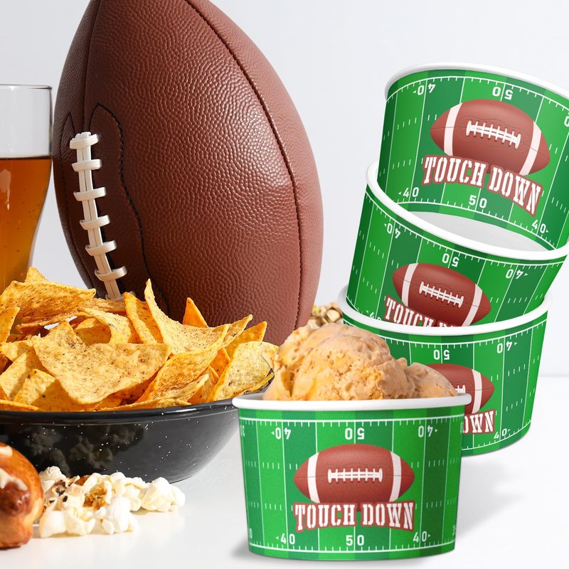 - Easy to Use: These football paper ice cream bowls are the perfect addition to sports themed party decorations. Paper bowls can be used to hold snacks, chili, soup, pasta, salad, ice cream, and more. Additionally, paper snack cups are disposable, saving you cleaning time, and keeping your kitchen and dining table tidy.