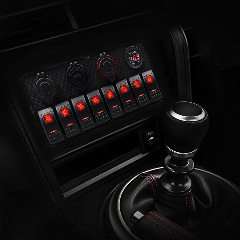 - [8 Gang Rocker Switch Panel] - Multifunction switch panel 8 on/off 5pin red LED rocker switch 8 circuit breakers for overload protection 12 volt power socket + 5V/2.1A & 5V/1A dual USB charger port + Professional Cigarette lighter + LED digital voltmeter.