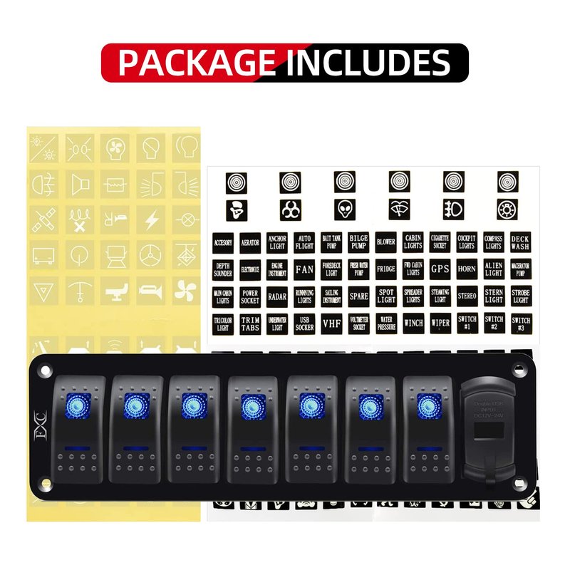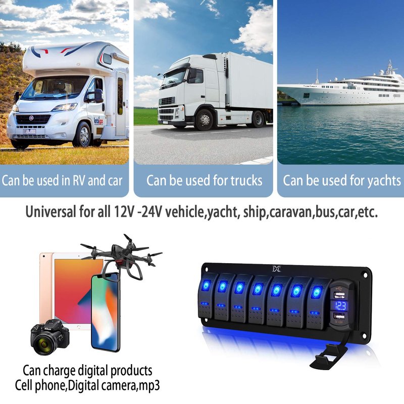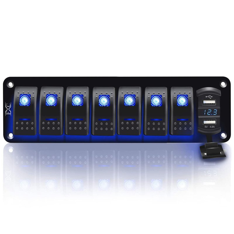 - 【Multi-Function Designed】7 Gang rocker switches with dual usb charger and digital voltmeter, great for all types of circuit control, charging needs and voltage monitoring.