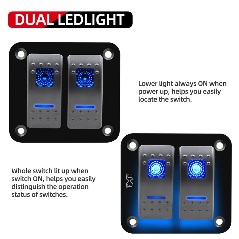 - ✔【DIY As You Like】 2-Gang Blue Aluminium illuminated Rocker Switch, these switches not be signed and you could assign the switches to your needs. Best match with wiring harness for controlling lighting of Led Light Bar, Led Work Lights, Fog Lamps, Headlights, Taillights and Auxiliary Lamps, etc.