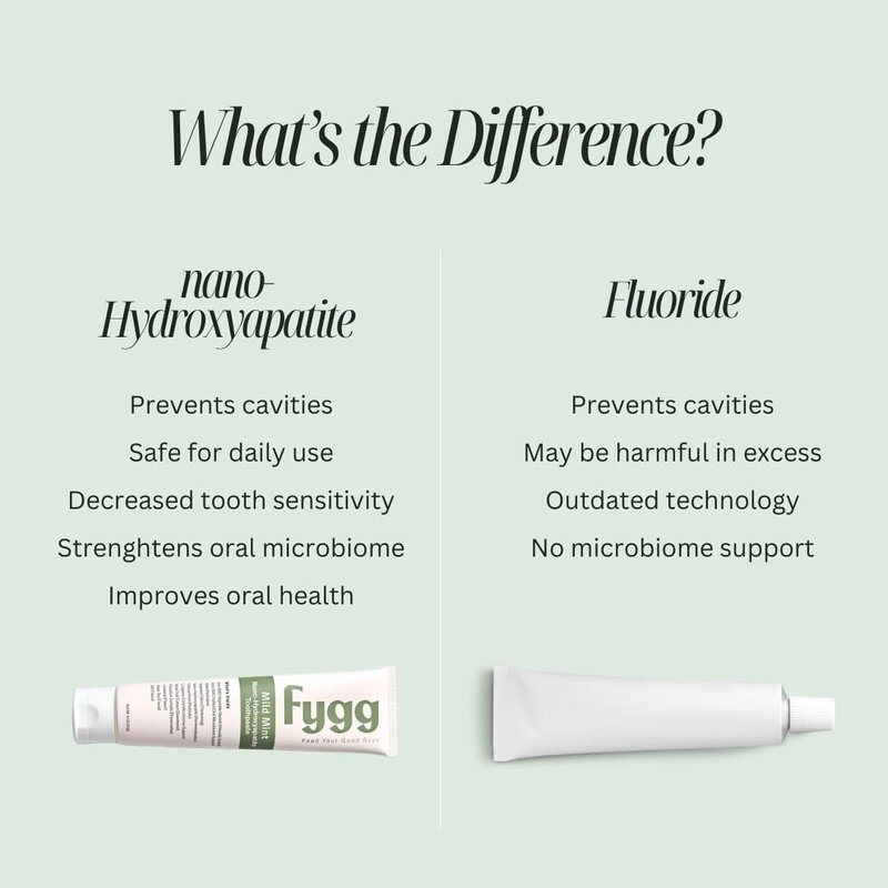 - Ideal for Sensitive Teeth | Nano-Hydroxyapatite (n-HA) Formula: Elevate your oral care with Fygg's 4-oz mild mint toothpaste. Engineered with nano-hydroxyapatite and micro-polish technology, this fluoride-free toothpaste not only strengthens and brightens but also effectively reduces sensitivity. Infused with L-arginine, xylitol, and our exclusive blend of proprietary ingredients
