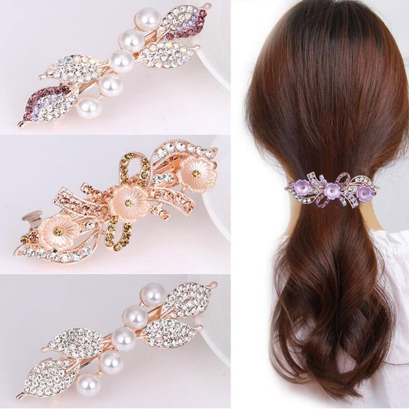 - ⚡🌸🎀【Great Material】Rhinestone bowknot hairpin,large pearl flower spring horsetail clip,ethereal,imitation diamond,will not damage hair in any way;Even if you wear it for a long time,the French hairpin is made of high-quality alloy,with shiny rhinestones and pearls on the top.French hair barrette looks exquisite,beautiful,unique,noble and elegant,and is popular with girls!