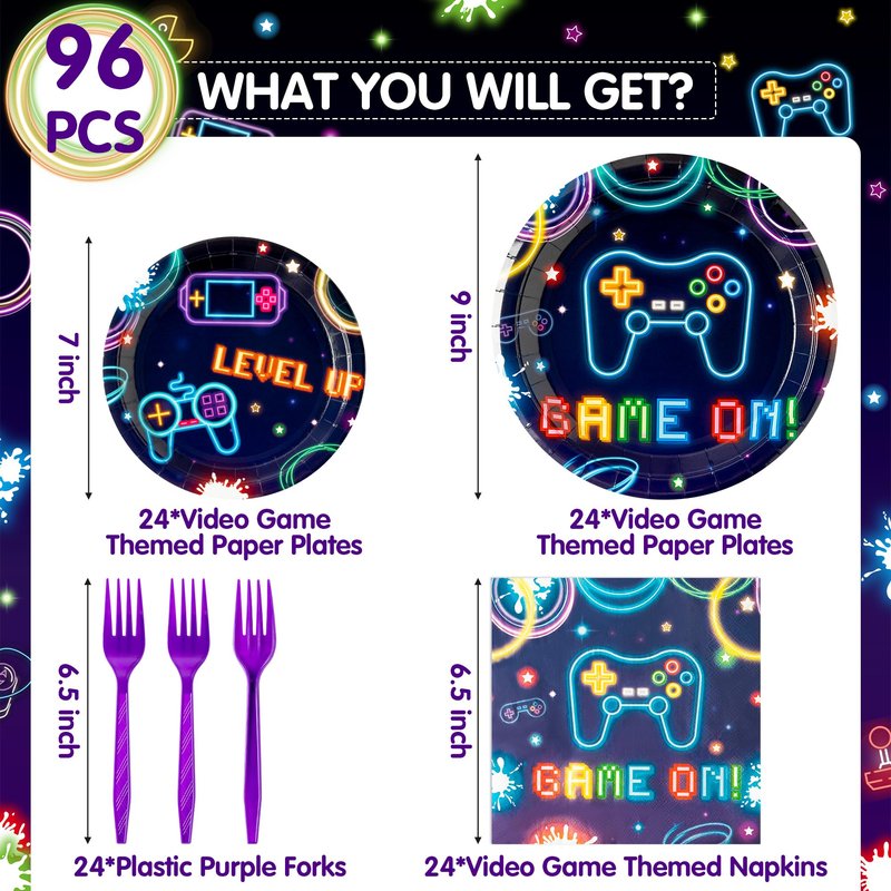 - SERVE 24 GUESTS: You will receive 24 9" video game themed paper plates, 24 7" video game themed paper plates, 24 video game themed napkins and 24 plastic purple forks, making it easy to serve a group of 24 guests.