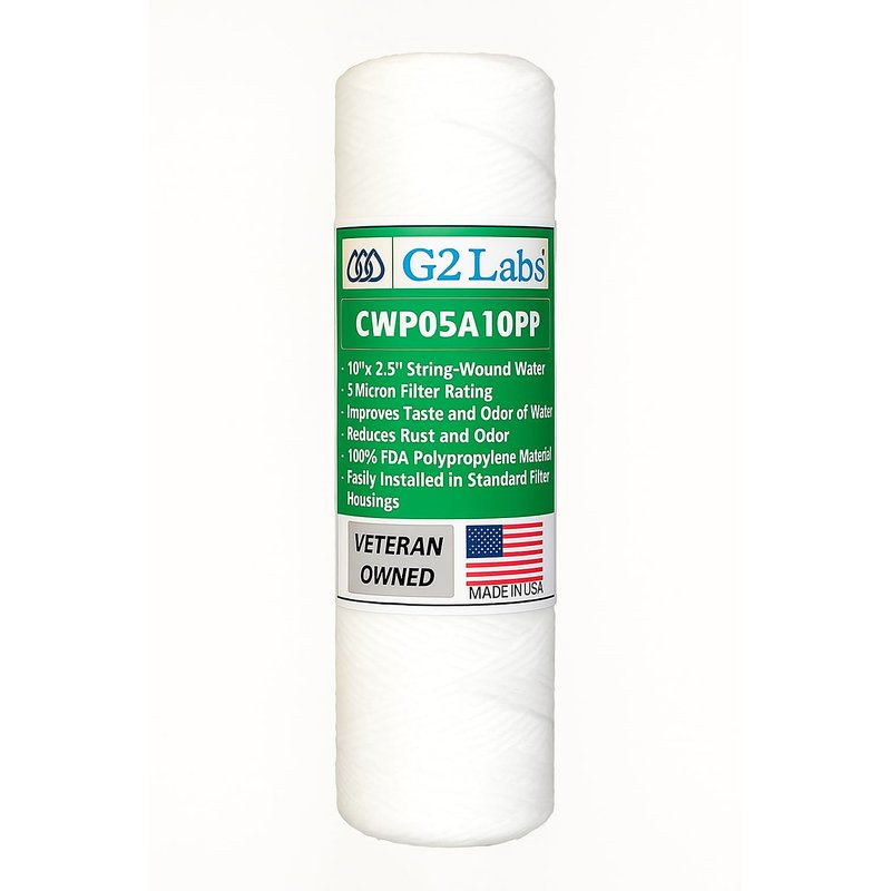 G2 Labs CWP05A10PP Polypropylene String Wound Water Filter; 10" Long, 5 Microns. Used in housings for removing sediment and contaminants in water, other liqiuids. 10"L x 2.5"D, 5 Microns.