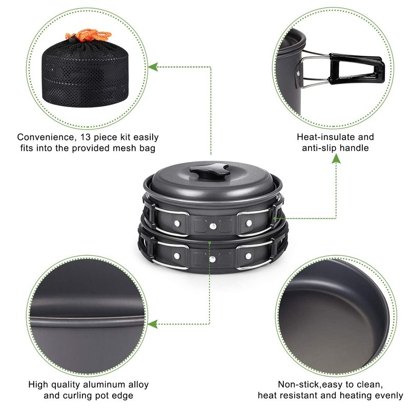 - Easy Packing & Taking: All the objects in this cooking set can be stored together in a mesh bag for space-saving and convenient carry. PERFECT COOKWARE FOR YOURSELF/ FAMILY- It is suitable for camping, hiking, backpacking, picnic, and other outdoor activities.