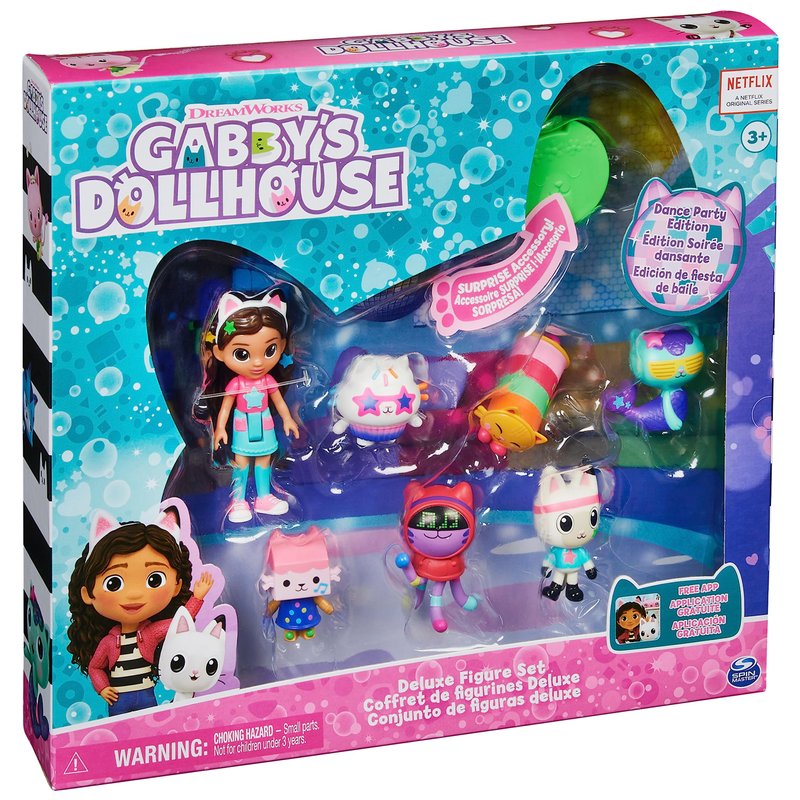 - 7 GABBY’S DOLLHOUSE TOY FIGURES: Featuring an exclusive dance party themed Gabby Girl doll and her cat-tastic kitty friends, Baby Box Cat, Cakey Cat, DJ Catnip, Mercat, Pandy Paws and Pillow Cat!