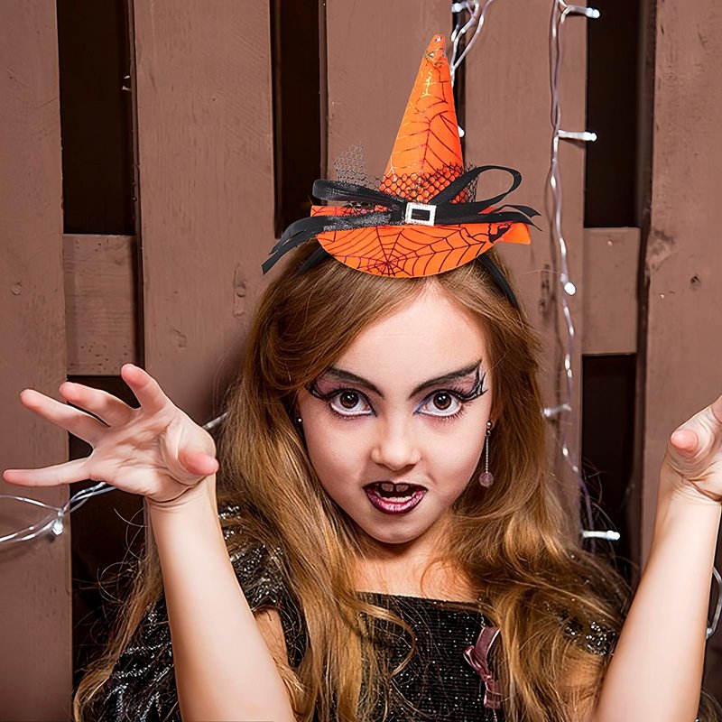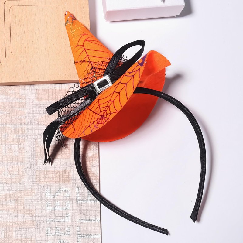 Featuring a cute pointed cap adorned with spider web patterns and a black bow, this Halloween headband is the perfect festive touch for you.