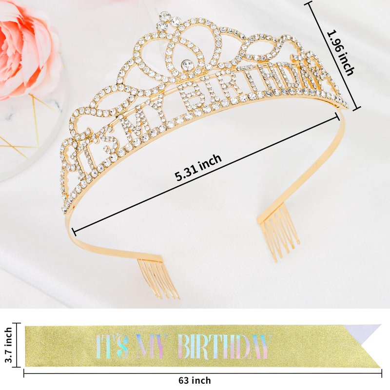 Birthday sash tiara set: IT'S MY BIRTHDAY crown + gold birthday sash decorate with "IT'S MY BIRTHDAY" pattern + hair clips Occasion: Perfect for birthday party supplies, parties, proms, anniversaries, photography, costumes and more! Also a suitable gift for for someone you love or respect.