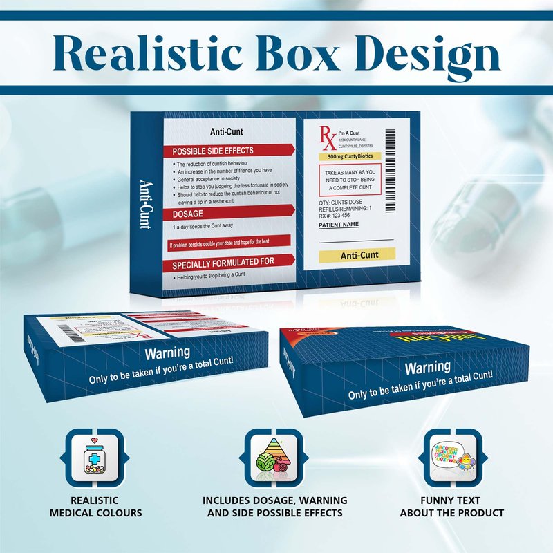 - 😆 Introducing the Joke Box of Pills - the ultimate prank for your unsuspecting friends and family! At first glance, the box looks like a real pharmaceutical product with its bold font, clinical color scheme, and official-looking dispensary label. But upon closer inspection, you'll notice a rude name that's similar to that of some real pills, hinting at the prank to come.