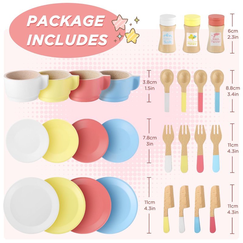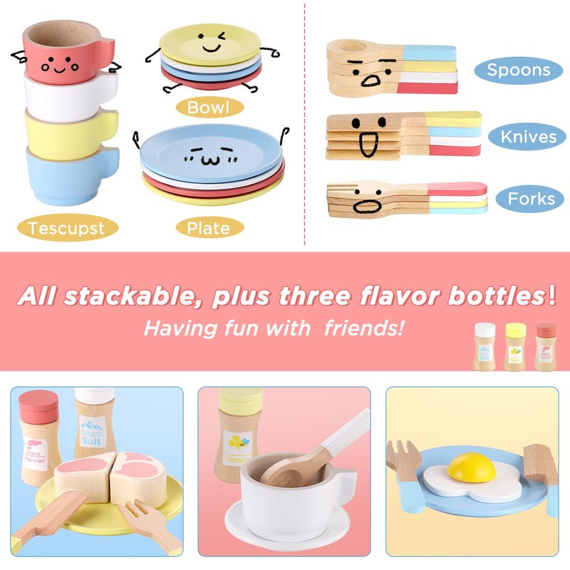 - 【27PCS Wooden Play Kitchen Accessories】The toddler kitchen playset includes 4*plates, 4*saucers, 4*cups, 4*spoons, 4*knives and forks, 2*condiment bottles,1*sugar jar. The toys are sized to fit children's small hands for all their dress-up dinner party needs.Upgraded stackable drop design, closer to life, convenient storage.