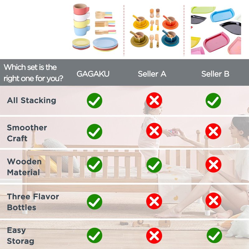 - 【Safe Material】GAGAKU's wooden play food sets toys are made of high grade wood with non-toxic and odorless water-based paint. The wood is more durable and has smooth edges compared to plastic on the market, allowing your child to play without fear of injury.