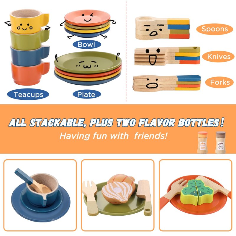 - 【26PCS Wooden Play Kitchen Accessories】The toddler kitchen playset includes 4*plates, 4*saucers, 4*cups, 4*spoons, 4*knives and forks, 2*condiment bottles. The toys are sized to fit children's small hands for all their dress-up dinner party needs.