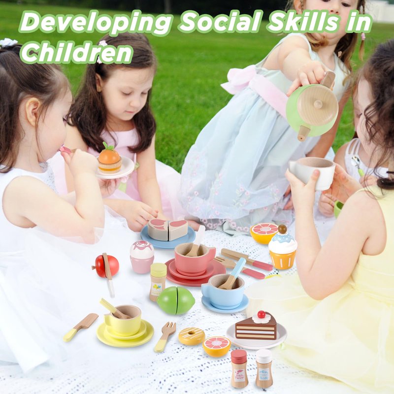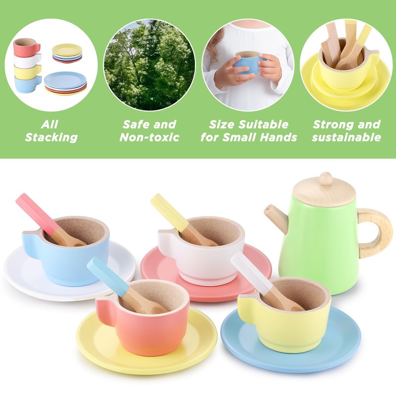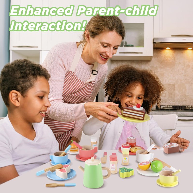 - 【Wooden Tea Set and Wooden Play Dishes 2 in 1】Our wooden play kitchen accessories is tea set and play dishes 2-in-1 that is a great way for kids to enjoy afternoon tea party time with family or friends. It also promotes children's social, emotional and motor skills; enhancing imagination and creativity in conversation.