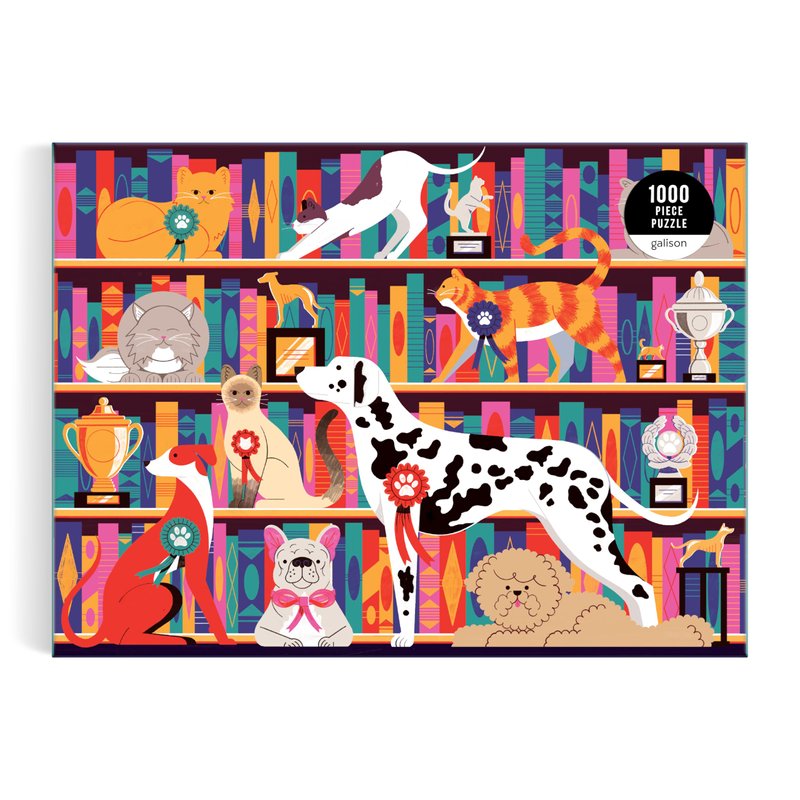 - 1000 PIECE PUZZLE – Best In Show 1000 Piece Puzzle by Galison is a witty shelfie of best in show felines and canines sharing shelf space with trophies and books. This puzzle is just the right level of challenge for the whole family to join in on for hours of puzzling fun! The box includes an insert with the full puzzle image for reference.