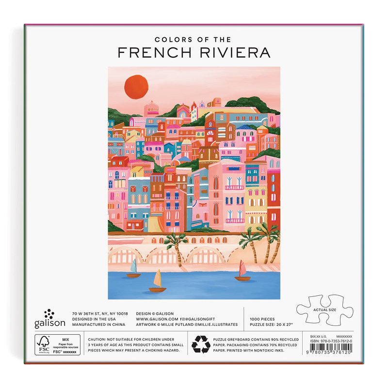 - 1,000 PIECE PUZZLE – Colors of the French Riviera 1000 Piece Puzzle from Galison is just the right amount of challenging and fun for a few days of activity. The box also includes a puzzle image insert for reference.