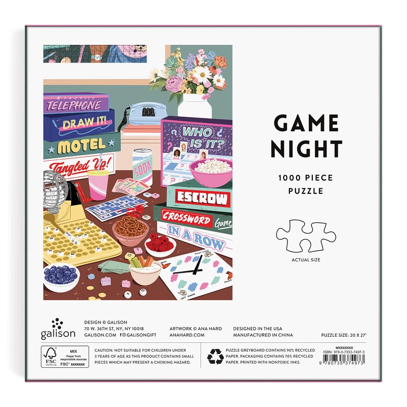 - 1,000 PIECE PUZZLE – The Game Night 1000 Piece Puzzle from Galison is just the right amount of challenging and fun for a few days of activity. The box also includes a puzzle image insert for reference.