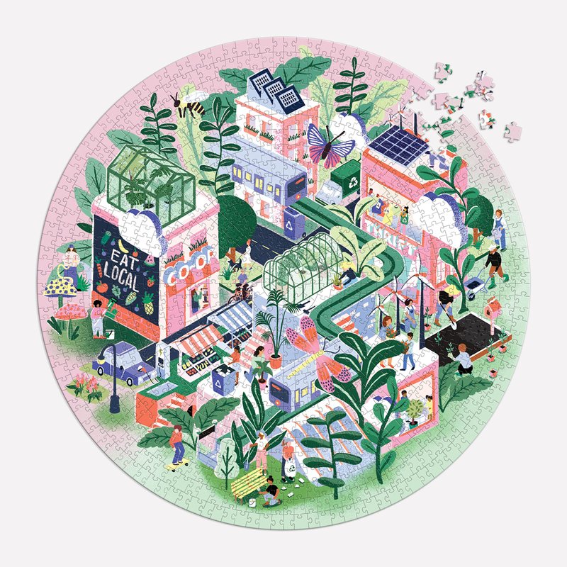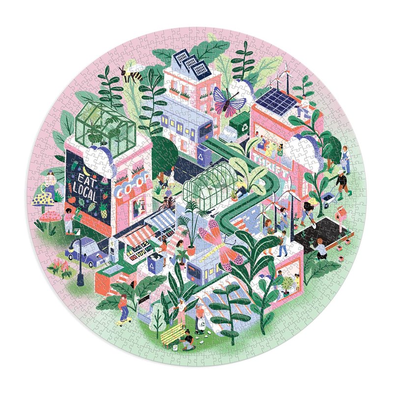 - 1,000 PIECE ROUND PUZZLE – The Green City 1,000 Piece Round Jigsaw Puzzle from Galison is just the right level of challenge for a few days of activity. The box also includes an insert about the artist and the image for reference.