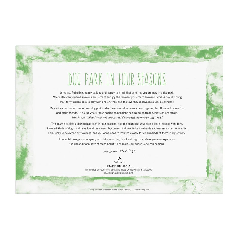 - 1,000 PIECE PUZZLE – The Michael Storrings Dog Park in Four Seasons 1000 Piece Puzzle from Galison is just the right amount of challenging and fun for a few days of activity. The box also includes a puzzle image insert for reference.