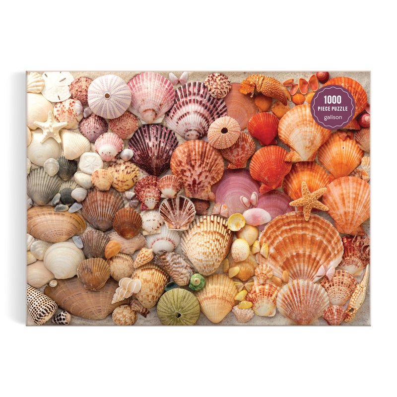 - 1000 PIECE PUZZLE – Vibrant Seashells 1000 Piece Puzzle by Galison features an arrangement of seashells on sand, arranged chromatically for a cohesive puzzle composition. This puzzle is just the right level of challenge for the whole family to join in on for hours of puzzling fun! The box includes an insert with the full puzzle image for reference.