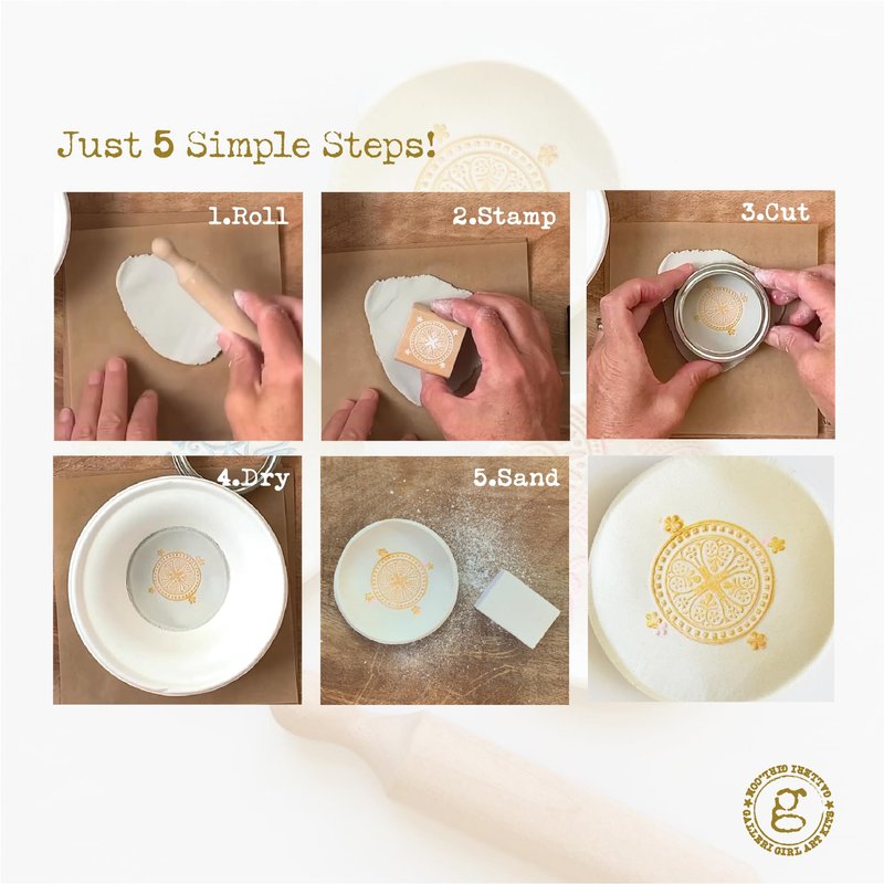 - INCLUDES: Easy to follow on-line video tutorial, non-toxic premium quality air dry clay, wood rolling pin, 2 rubber stamps, 3 colorful ink pads, transfer, and cotton lace to create your designs, a metal circle to cut your shape, bowls for drying, and a sanding block to smooth out the edges.