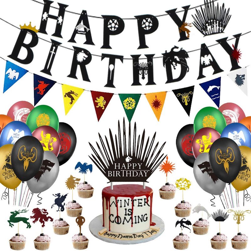 - What You Get: 1 Pack Black Happy Birthday Banner, GOT Banner, Cake topper, 36 pcs GOT balloon and 24 pcs Cupcake Toppers; All MONEY-BACK Guarantee at any time if not satisfied our products
