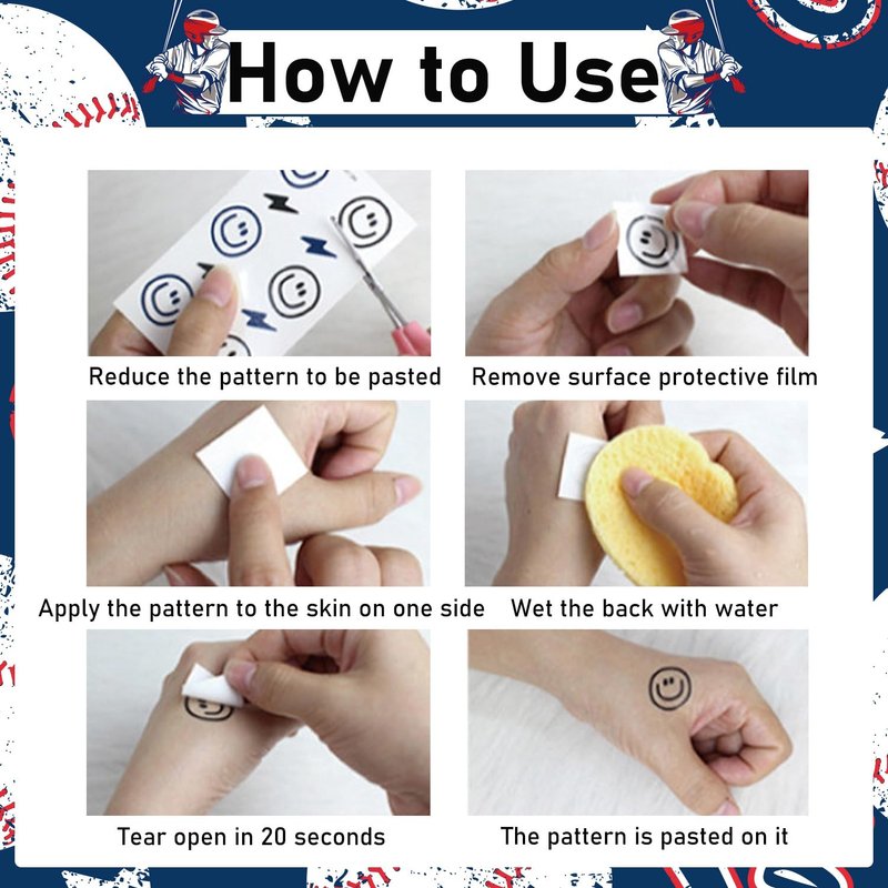 - How to Use: Our tattoo stickers come with application steps so you can have multiple tattoos with ease. Perfect for baseball themed parties, costume parties, baseball baby showers, birthday parties and more.