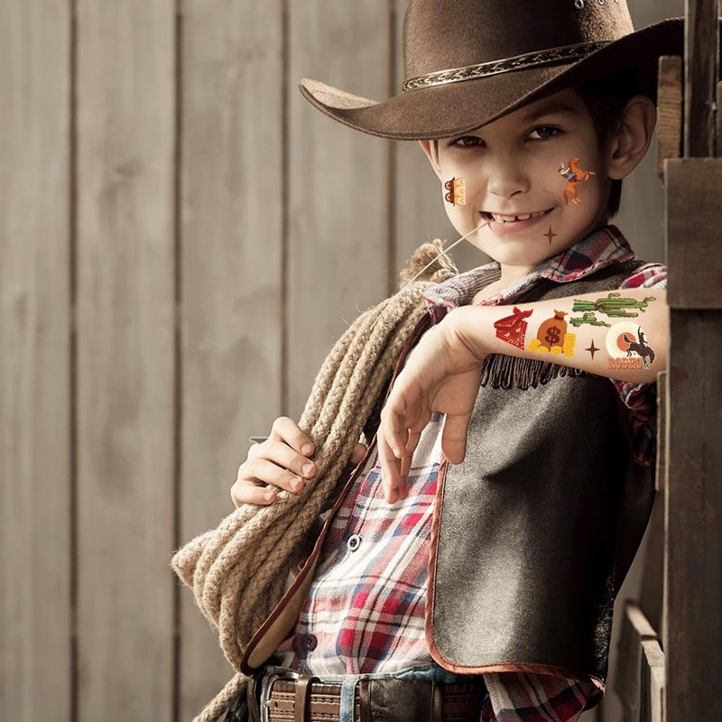 - Cowboy Temporary Tattoo: The tattoo stickers are based on the theme of the western cowboy. It is a perfect match for boys to use temporary tattoos at parties. Temporary tattoos can easily provide you with cool body makeup!