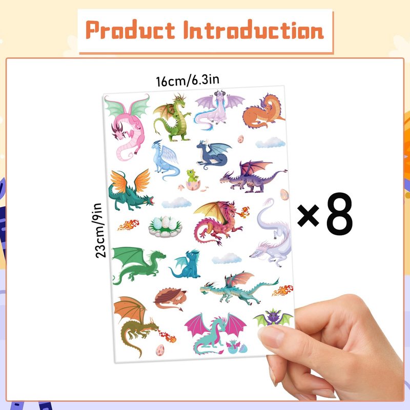 - Dragon Temporary Tattoos: Each tattoo sticker measures 9 inches x 6.3 inches, 8 sheets in total, each tattoo sticker has over 25 different dragon tattoo designs, so you can get over 220 small tattoos!