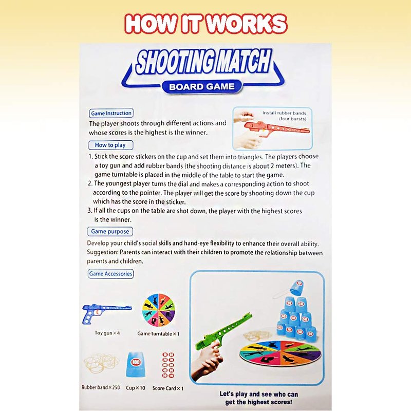 - FUN TARGET PRACTICE: A shooting game for kids with a super fun twist! This target practice set comes with 3 toy gun rubber launchers, 100 rubber bands, a game turntable, 10 cups, and score stickers for the cups. Perfect for 1-3 players, it’s a recipe for glee-filled fun.