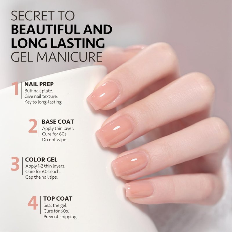 - Tips: Buff your nail bed lightly before applying base coat to prevent early peeling off. Apply top coat after color gel for shimmery finish.